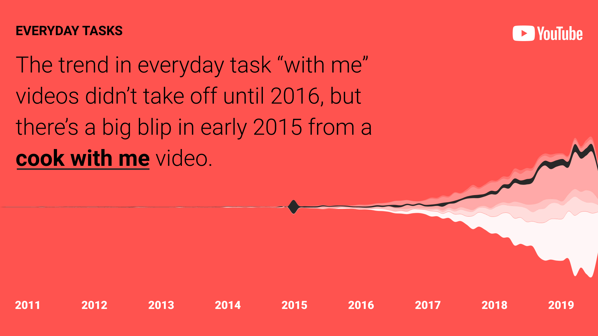 We analyzed a collection of videos that contained the phrase “with me” in the title. After excluding music videos (e.g., Frank Sinatra’s “Come Fly With Me”), we determined which words were most commonly paired with the phrase “with me,” such as “draw,” “study,” “travel,” etc.